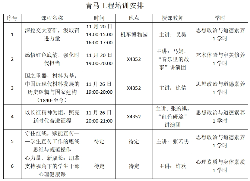 6、每位同学至少线下完成4场培训方可获得结业证书。对相关专题感兴趣的同学可参与培训,完成学习后可获得对应学时。因特殊情况请假的一次培训 ,各位学生干部请提交培训心得,心得体会必须手写,不少于1000字,交大信纸或A4纸,交至年级辅导员处,由年级辅导员把关是否合格,培训结束后一周内以年级为单位统一交至马娟老师处。