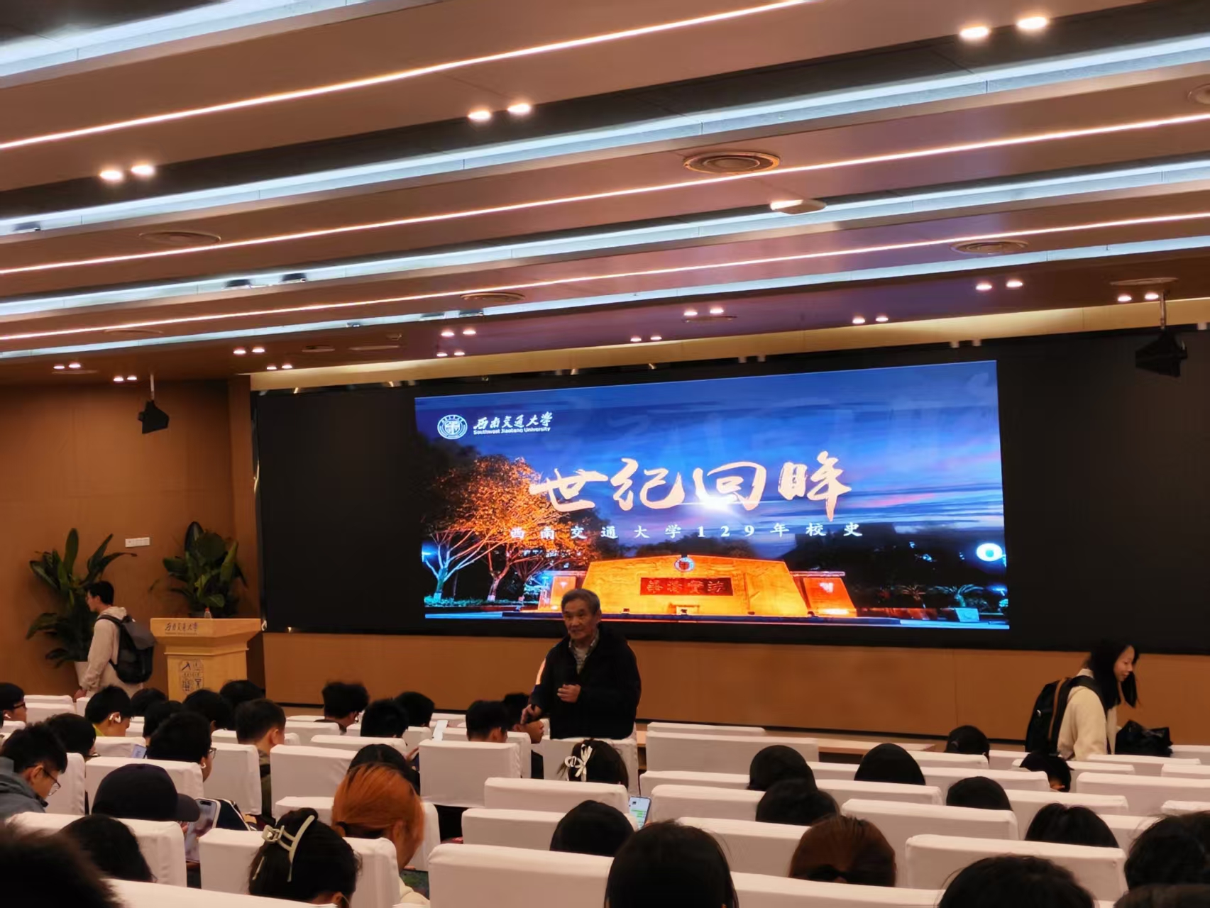 梁教授以“从岁月中走来,向未来中走去”为主题,结合珍贵的校史照片、文献资料和亲身经历,生动讲述了学校自1896年创办以来的关键发展节点。从初创榆山的艰难探索,到扩建犀浦的逐步壮大;从学科专业的迭代升级,到人才培养成果的不断涌现;从优良校风的积淀形成,到百年精魂的传承铸造。一个个鲜活的故事、一组组翔实的数据,“竢实扬华,自强不息”的精神煜煜生辉,让在场学生深刻感受到学校一百二十九余载的厚重底蕴与奋斗精神。