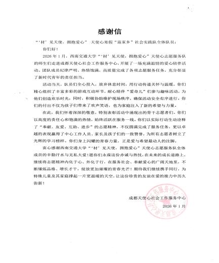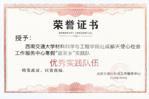 本次“‘材’见天使,拥抱爱心”寒假“返家乡”社会实践活动圆满结束,成都天使心社会服务中心为实践队颁发“优秀实践队伍”证书并发来感谢信,获得了主办方及参与家庭的高度认可。