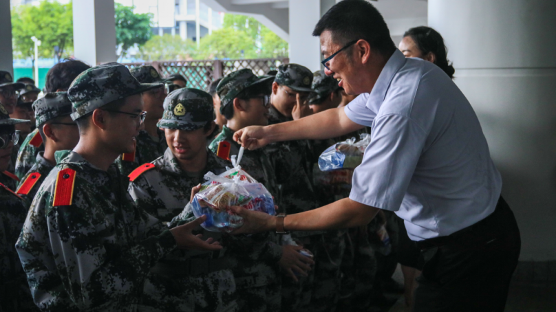 慰问过程中,沈哲、熊钰和新生辅导员们将提前准备好的运动饮料、零食等物资逐一递到新生手中,以实际行动传递学院的关怀。沈哲对新生们在军训中的表现给予肯定,对大家展现出的纪律意识、团队精神与吃苦精神表示称赞。他强调,军训作为大学生涯中不可或缺的“第一课”,不仅是国防教育的重要载体,更是锤炼意志、塑造品格、增强集体荣誉感与责任感的关键契机。他也深情回忆起自己的军训岁月,并说道,“终将成为你们大学生涯中最珍贵、最温暖的一段记忆。”他鼓励同学们珍惜此次军训机会,用心体会过程中的每一份感受,收获真挚的同学情谊,并将军训中养成的优良作风与坚韧品质融入未来的学习和生活中,以更昂扬的姿态迎接大学生活的挑战。随后,一行人还与新生亲切交流,关切询问大家的训练情况、训练感受和生活需求:“感觉怎么样?”“训练强度能接受吗?”一句句关心的话语,让训练场的氛围变得格外温馨。