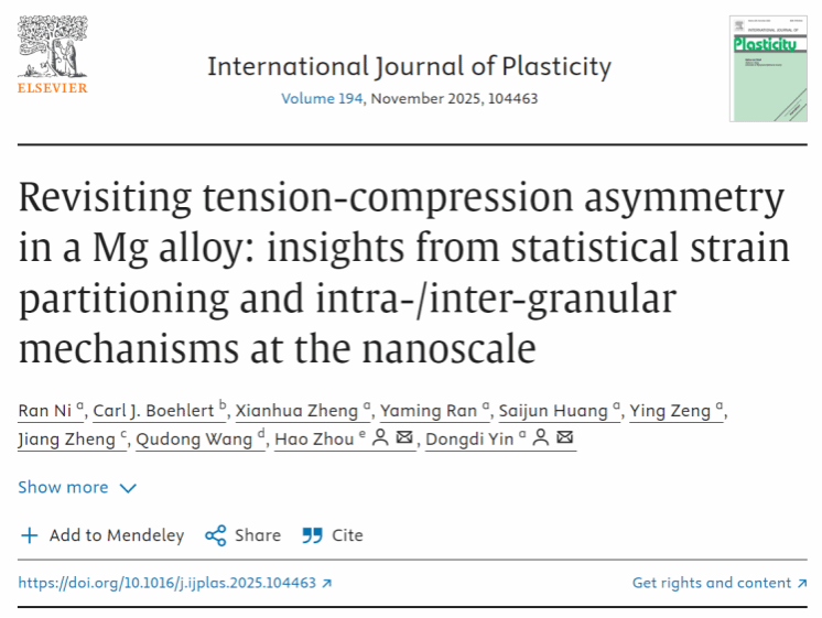 近日,我院尹冬弟教授、博士生倪然,联合辽宁材料实验室周浩研究员等,基于自主开发的晶粒变形多模态自动分析框架(AutoGrainDAM),结合HRDIC与EBSD数据融合技术,突破了以往研究多孤立考察单一变形机制的局限,从同时考虑晶内与晶间变形机制和应变分配的新视角重新审视了镁合金的TCA问题。统计及定量分析结果表明,典型变形事件所导致的应变分配、滑移活性与GBS均表现出显著的TCA。该研究首次定量揭示了应变分配和GBS的TCA,强调了将晶内变形、晶间变形与应变分配三者结合,对于全面理解镁合金拉压不对称机制的重要性。相关工作以“Revisiting tension-compression asymmetry in a Mg alloy: insights from statistical strain partitioning and intra-/inter-granular mechanisms at the nanoscale”为题发表在金属材料领域高水平期刊《International Journal of Plasticity》。论文主要合作者还包括密歇根州立大学Carl J. Boehlert教授、重庆大学郑江副教授、上海交通大学王渠东教授等。