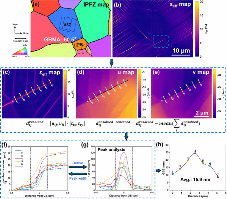 更为重要的是,我们知道,多晶塑性变形本质上是晶内与晶间变形机制协同与竞争的结果。但遗憾的是,目前对TCA的研究大多局限于晶内(滑移/孪生)变形机制,针对晶间变形机制(如晶界滑动,GBS)的TCA研究亟待补充。长期以来,晶间变形的定量表征存在技术挑战,这或许是导致该方面研究被忽视的主要原因。近年来,高分辨数字图像相关(HRDIC)的快速发展使得纳米级全场应变测量成为可能。这些数据可用于提取晶界附近的变形、计算GBS值,并实现应变分配的定量分析,为系统研究晶内/晶间变形机制及其应变分配行为提供了有力工具。